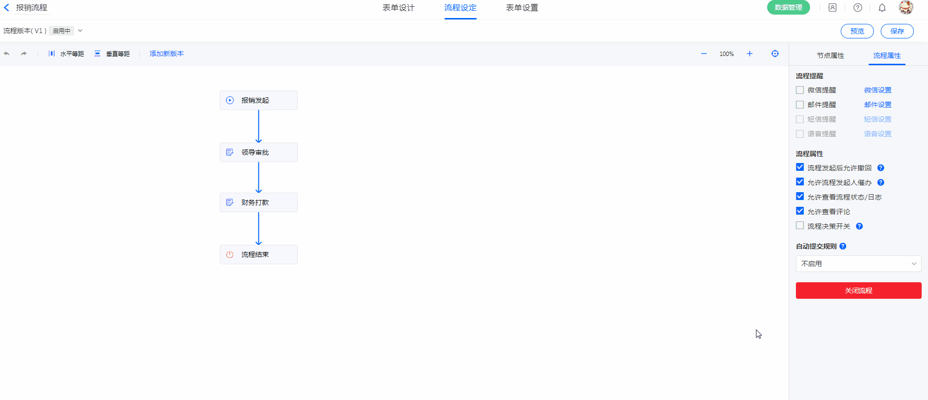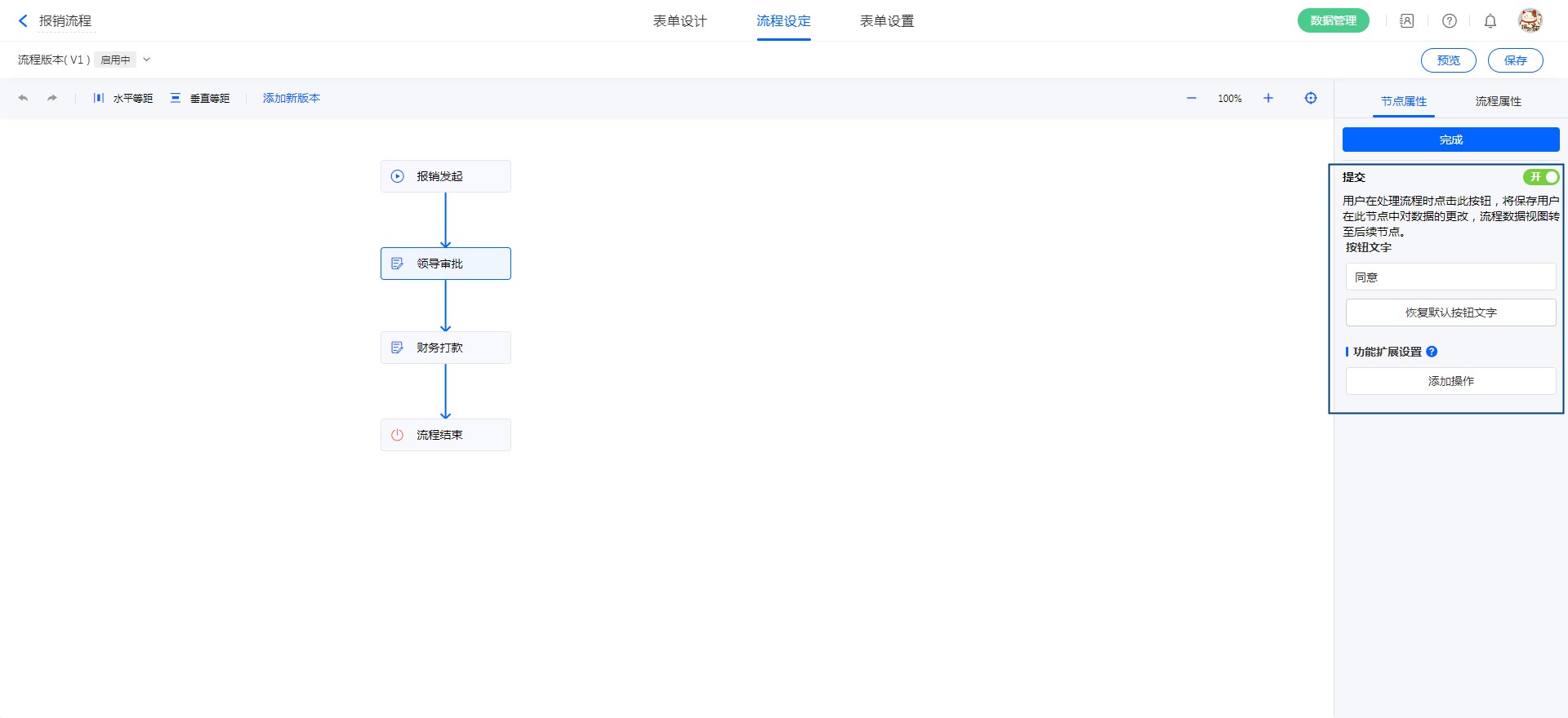如果我们需要实现流程审批是有同意和拒绝两个按钮,我们可以开启节点权限中的【提交】和【结束流程】,分别改名为【同意】和【拒绝】。