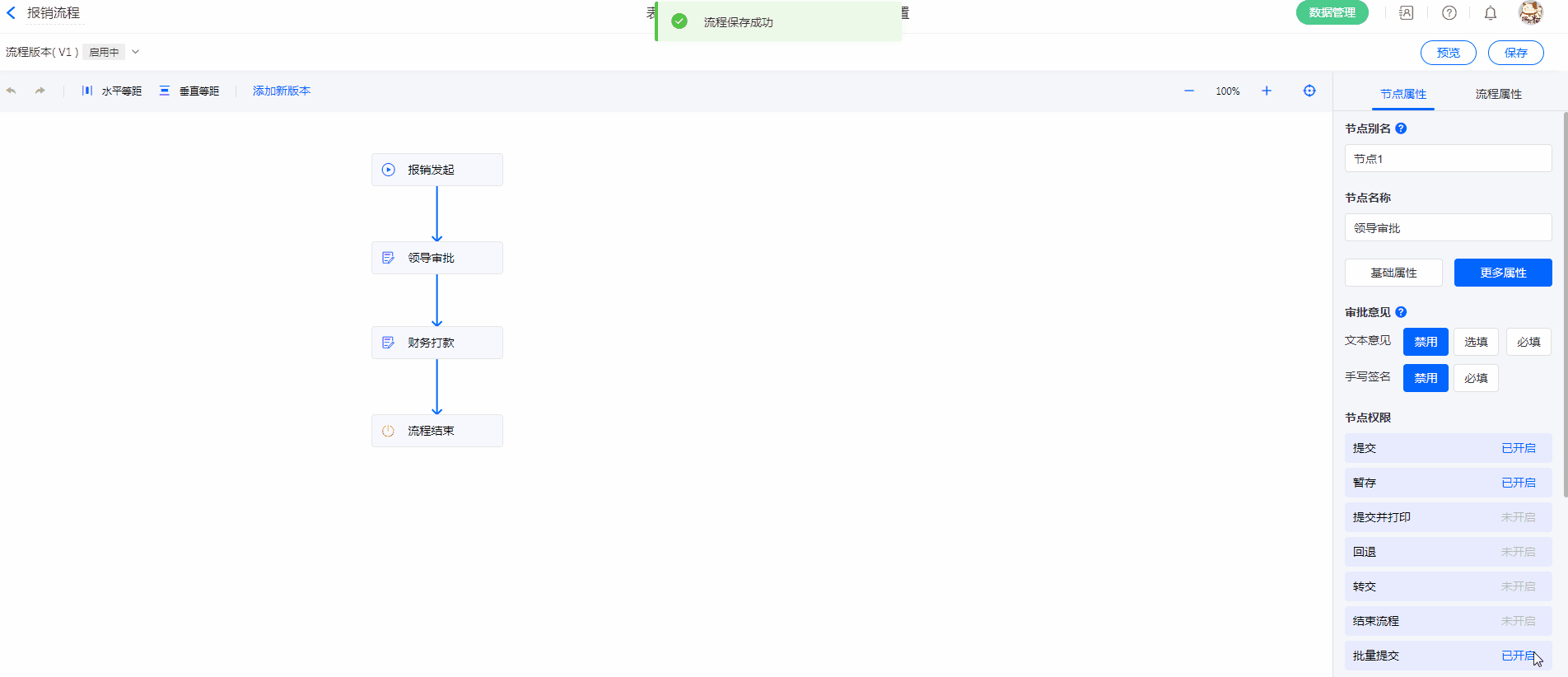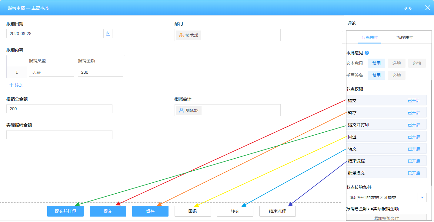每一个流程节点的节点权限包括提交、暂存、提交并打印、回退、转交、结束流程、批量提交这7种操作,所有节点权限均可自定义按钮文字和安装功能插件,除提交以外,其他节点权限均可根据需求关闭。