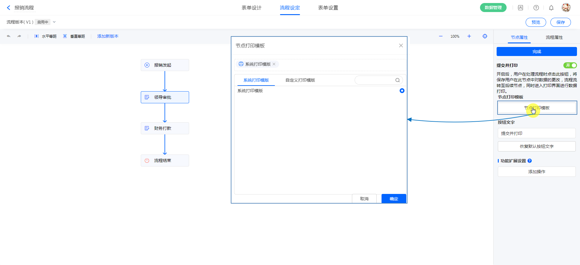 开启提交并打印后,可设置当前节点的打印模板。