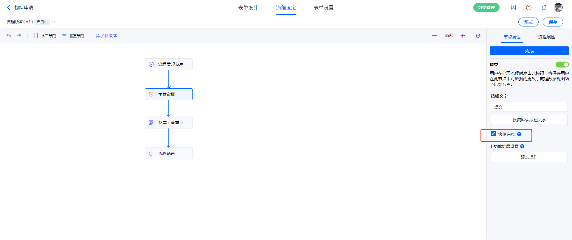 开启后,在流程待办界面,可以快速处理流程。