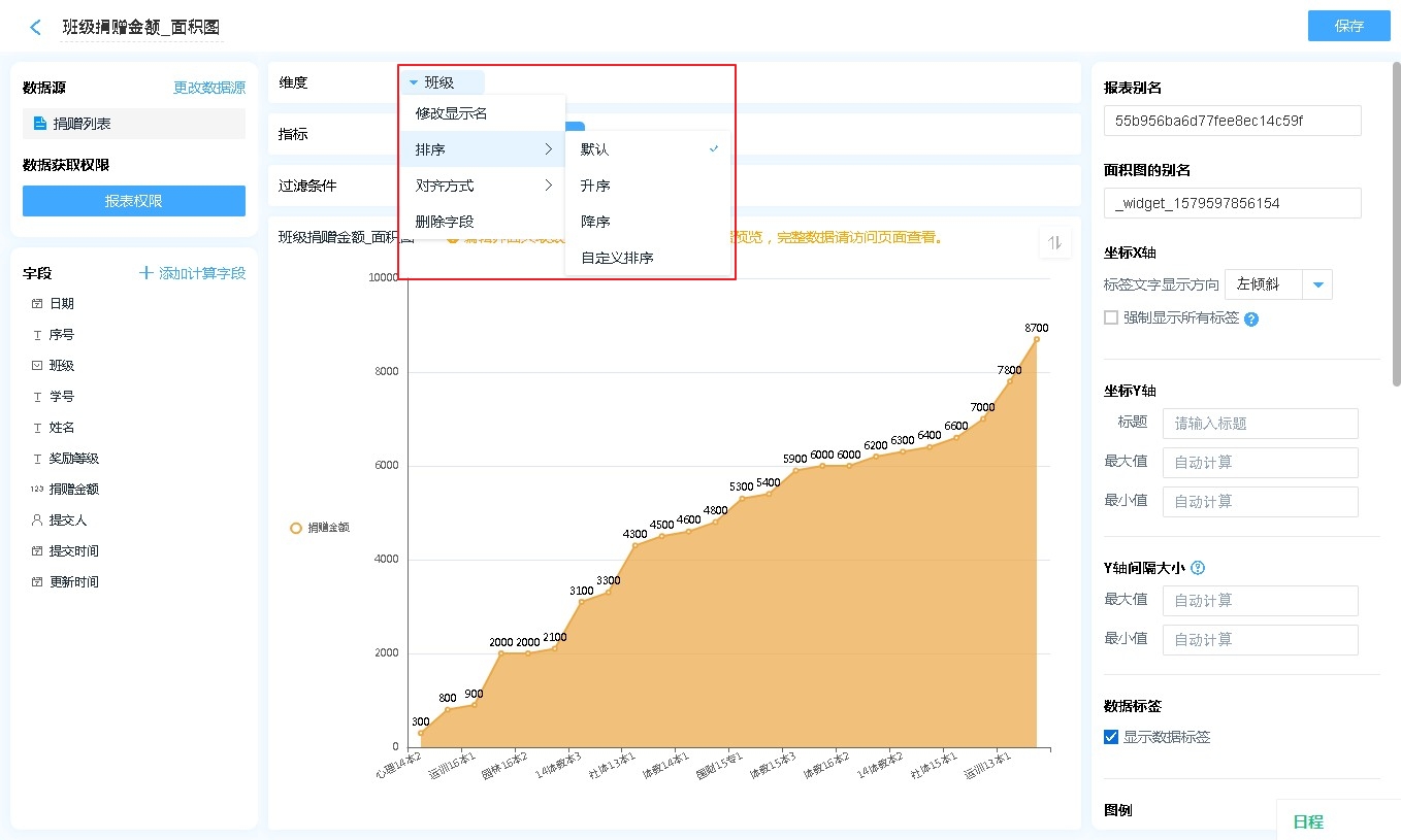 • 排序:支持按照指定的格式对面积图内的数据进行排序[默认为数据创建时间]