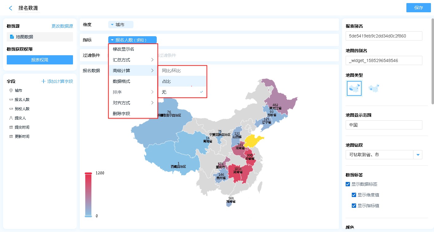 • 高级计算:高级计算可进行同环比、占比的计算,详见同环比和占比。