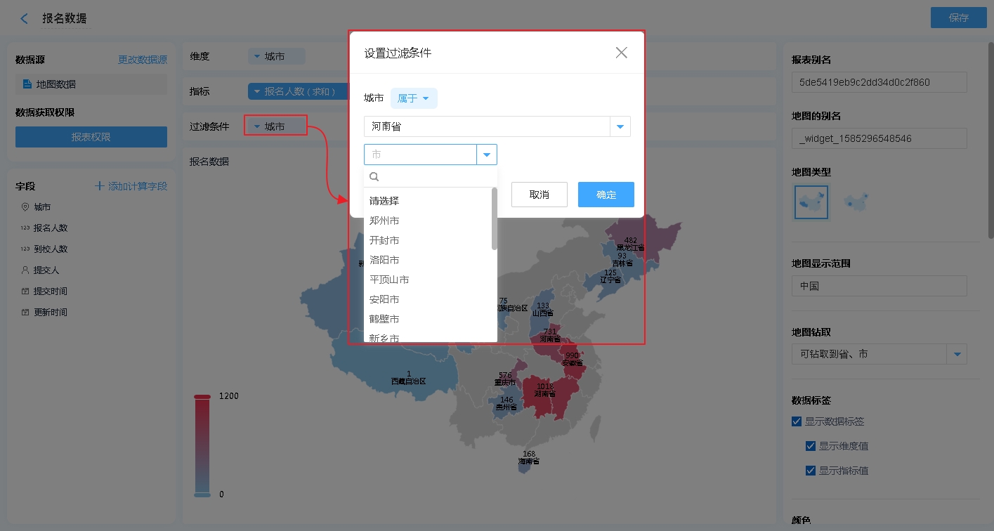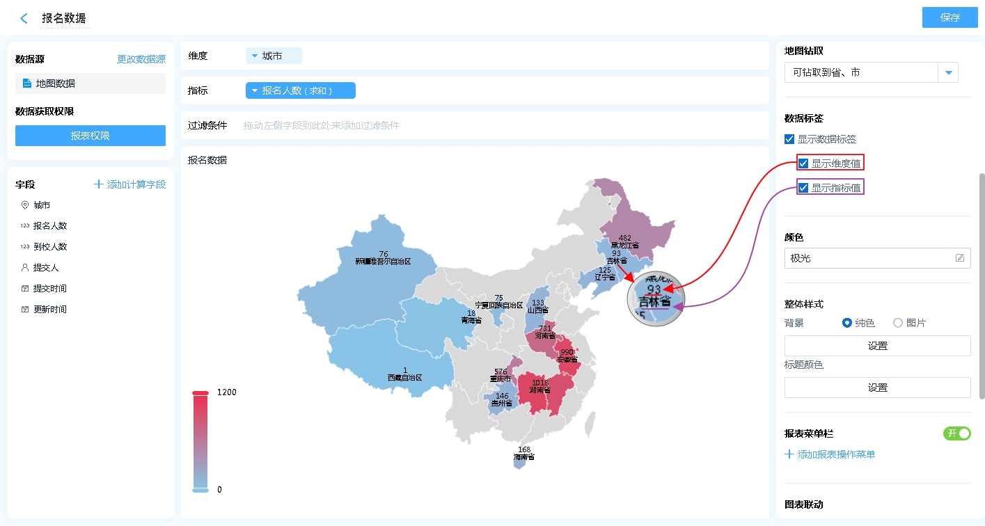 • 显示维度值:在地图上对应的区域显示维度的内容,一般情况下是省/市/县区信息。