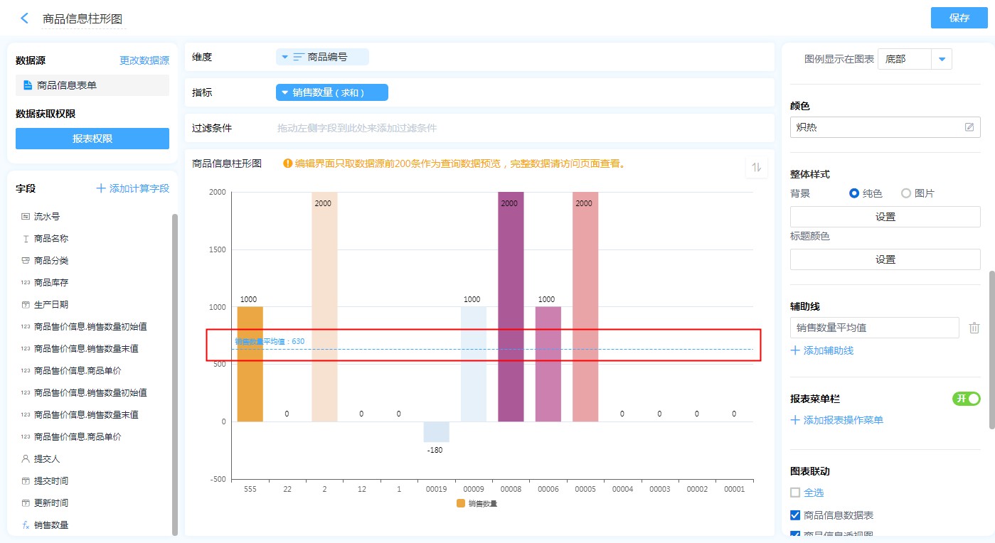 如,商品清仓时,每个种类的商品库存目标是30000件,将辅助线设置为固定值设置为30000,可以清楚的知道哪些种类的商品库存大于30000,需要大力清仓。