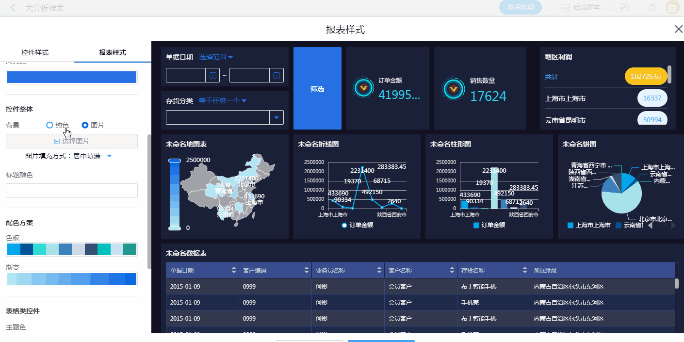 通过报表样式的设置,可快速完整报表整体风格的转换。同时,也可以对报表中某一图表的样式进行风格设置,优化视觉效果。
