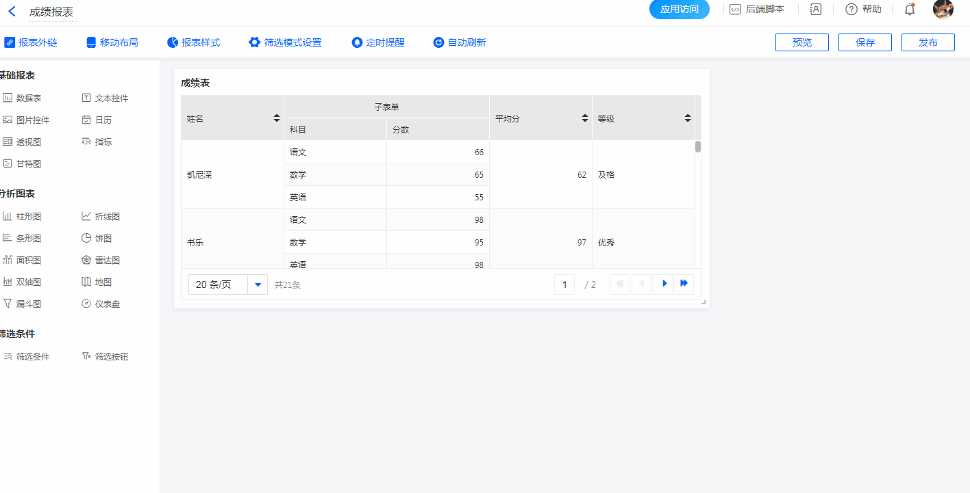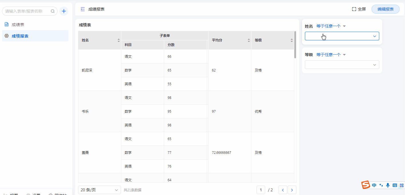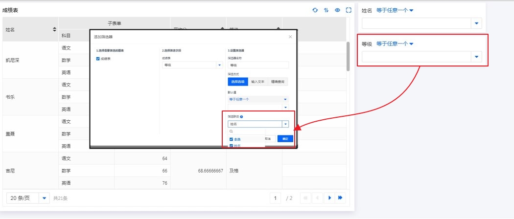 在设置报表筛选条件时,通常会设置多个筛选条件。筛选条件之间支持设置联动,被联动的筛选条件只会展示联动后的选项。比如,学生成绩报表有2个筛选条件:姓名和等级,在等级筛选条件中设置联动姓名,那么,筛选完等级后,姓名就只展示满足这个等级的选项。