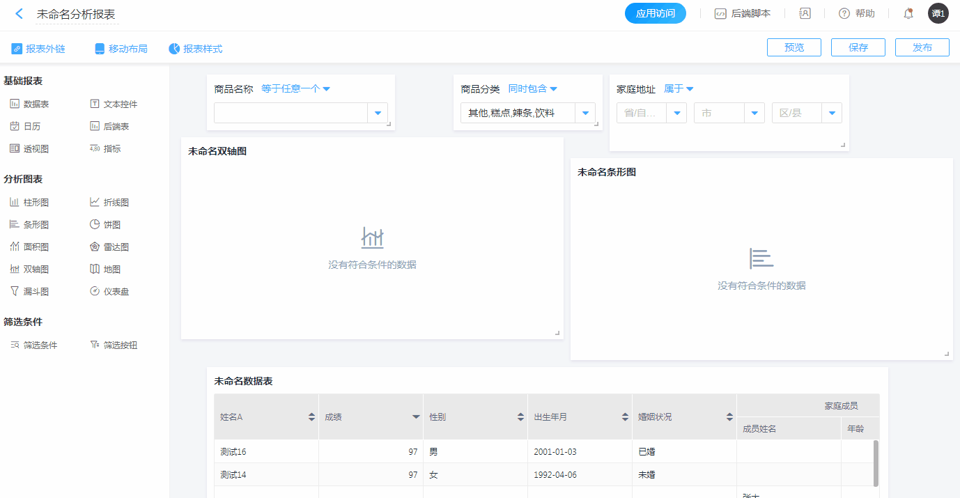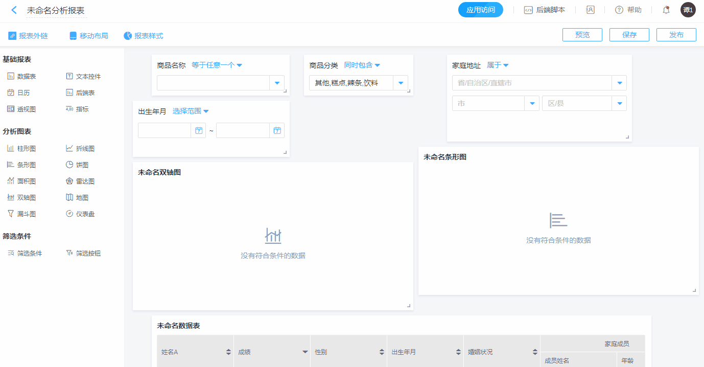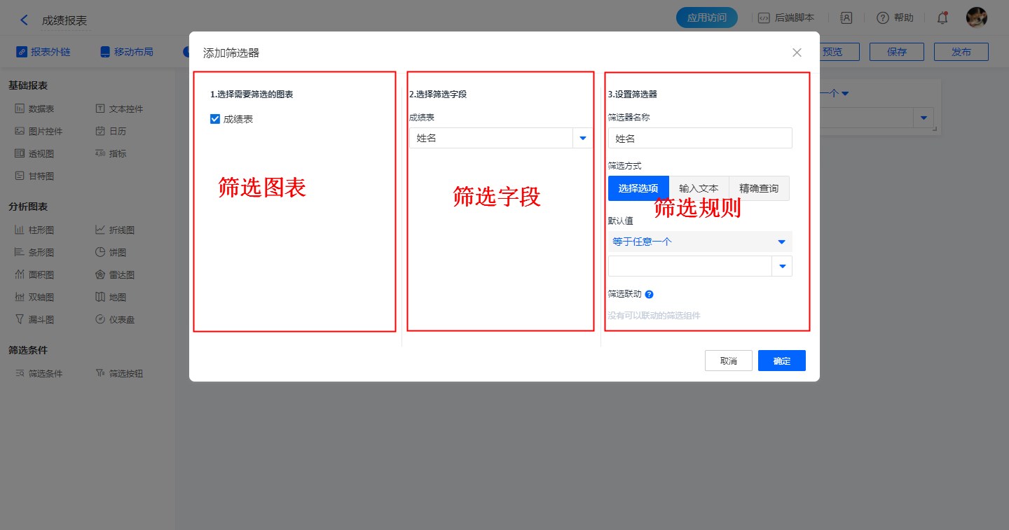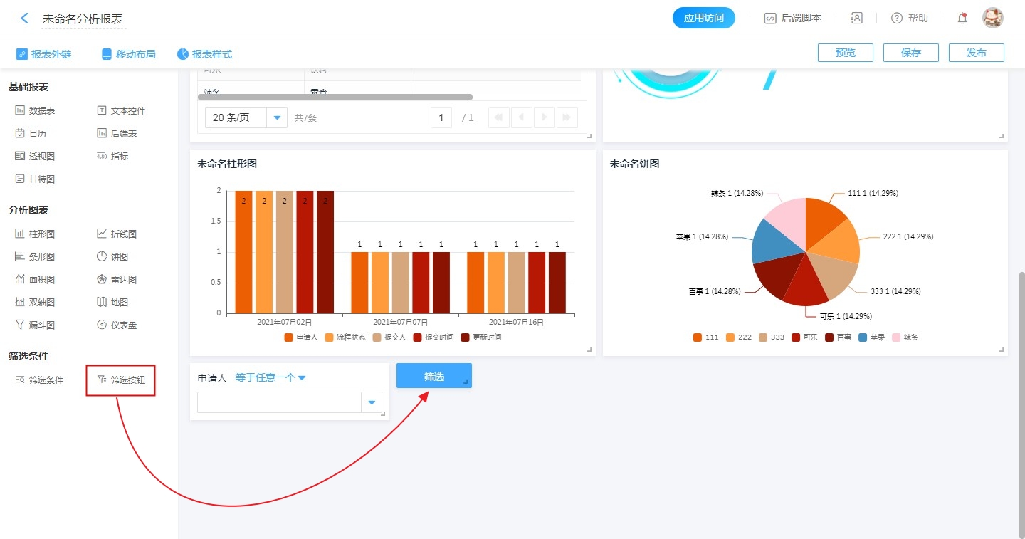 新报表内的报表组件设置好后,可设置筛选条件。