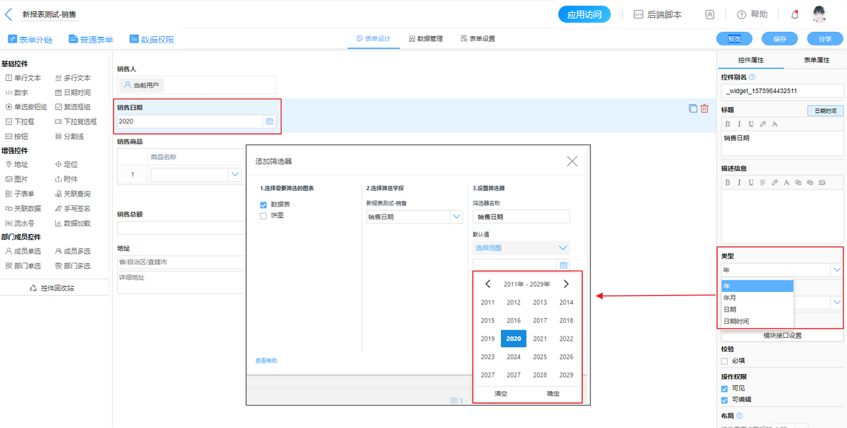 当日期字段的类型为【年】或【年月】时,筛选条件支持年月的设置。