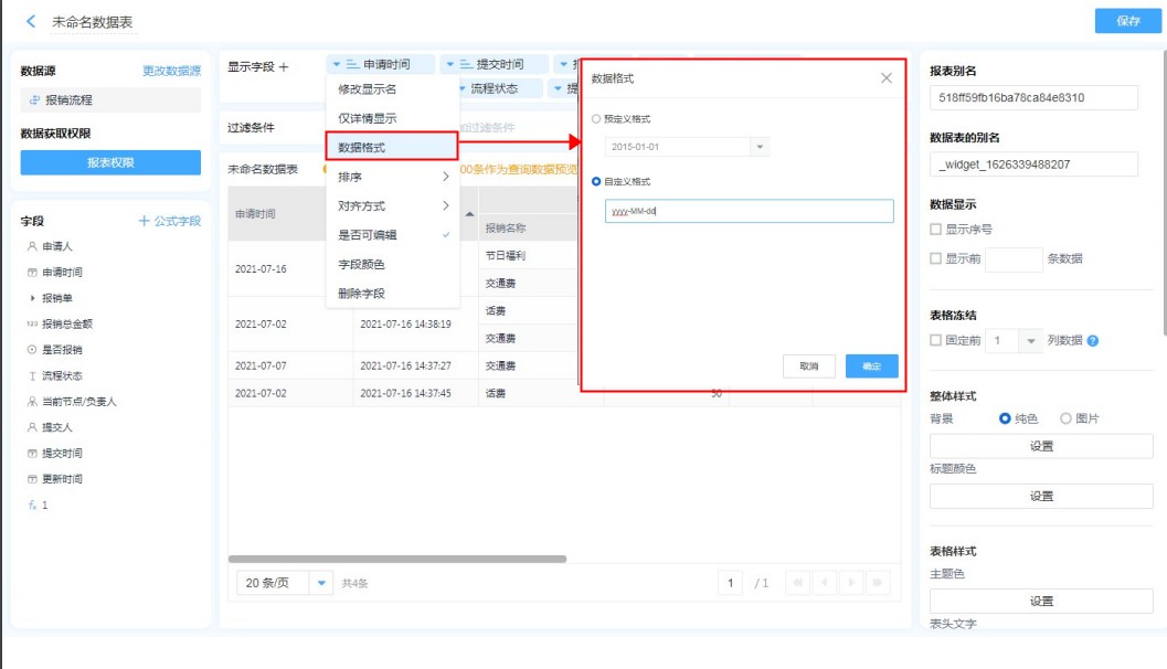 地址字段,日期字段,数字字段的格式设置很简单,只需要在报表中编辑字段,选择自己需要的格式即可。