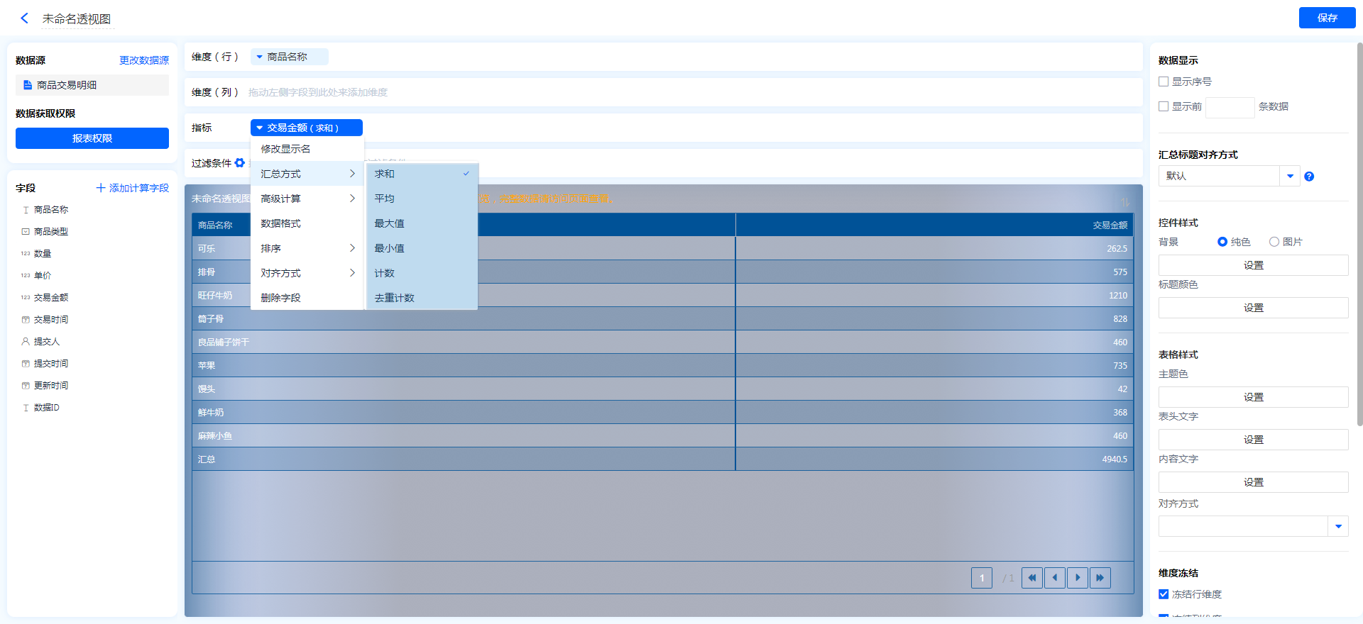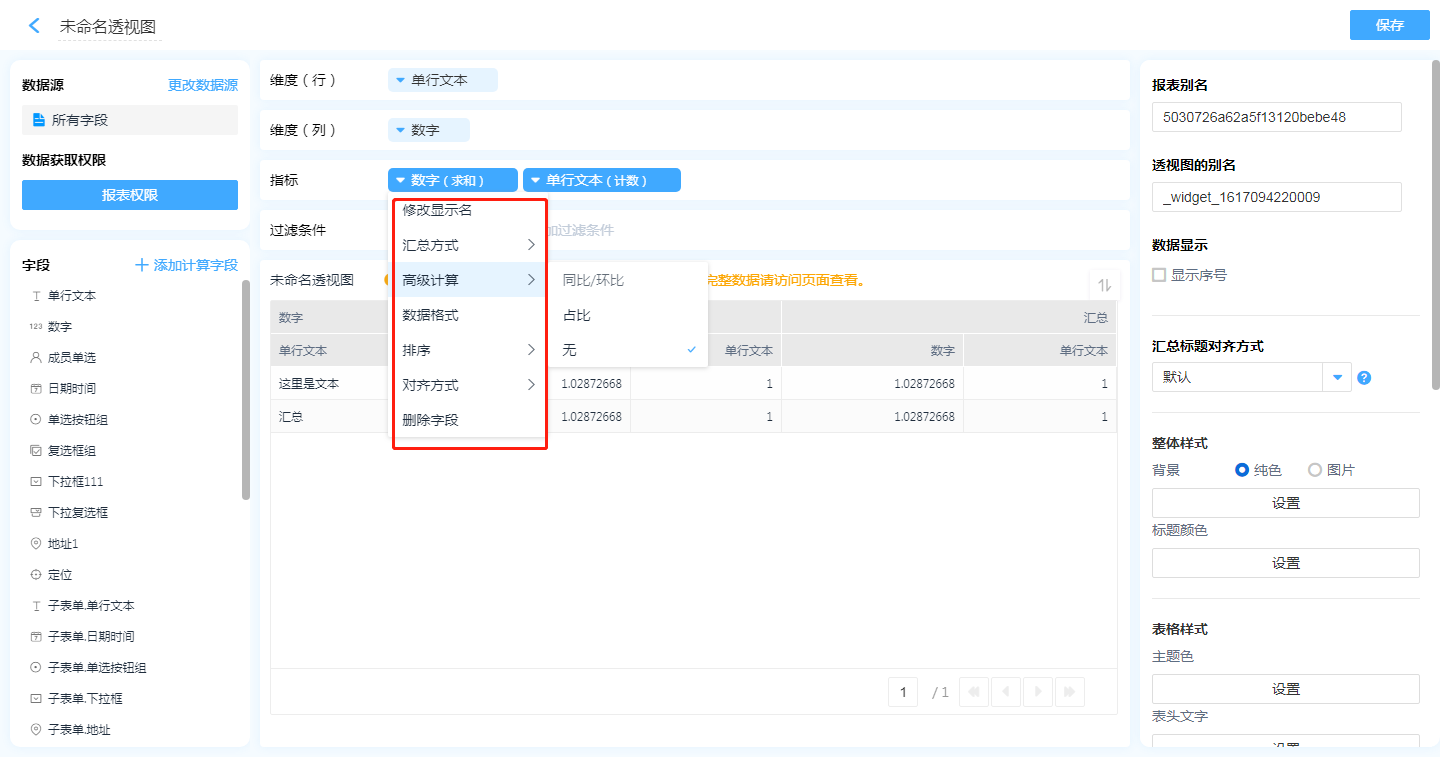 数字字段汇总方式支持:求和、平均、最大值、最小值、计数、去重计数。