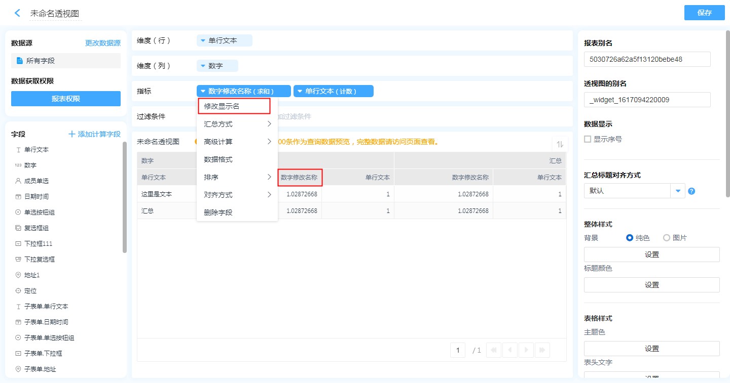 鼠标点击需要更改的字段,在下拉列表中点击「修改显示名」可以对字段重命名。