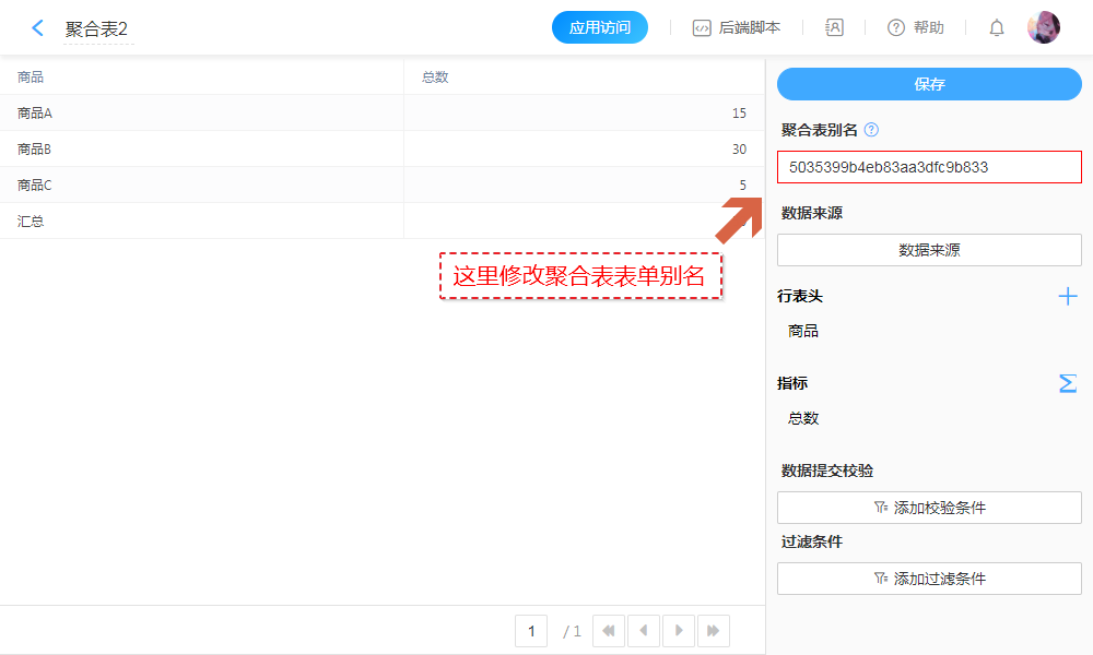 聚合表表单别名:用于后端开发者,通过别名查询聚合表数据。(默认未修改别名不方便识别)