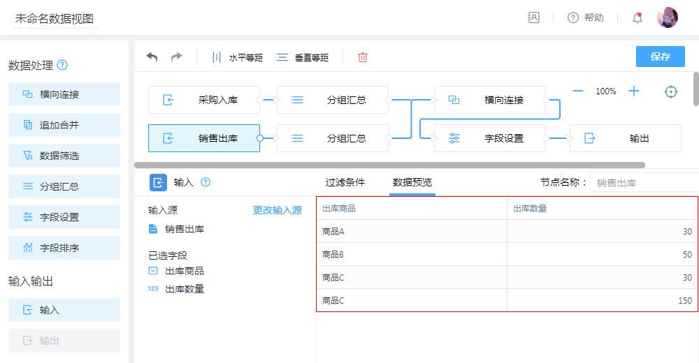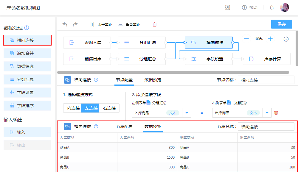 - 配置:横向连接,以“商品”为连接字段,把出入两表数据进行横向拼接,把“入库”与“出库”数据横向拼接为一张表。