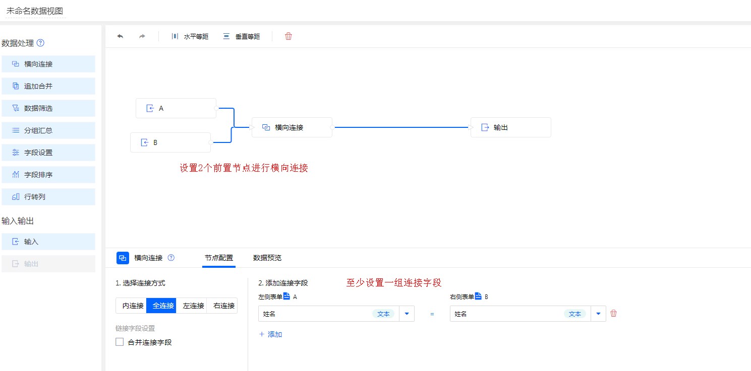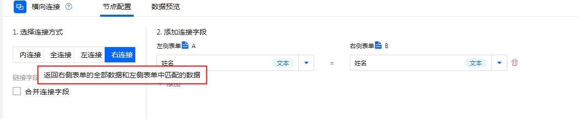 全连接:根据“连接字段”为条件匹配“表单A”与“表单B”,将两边表单数据全部展示。