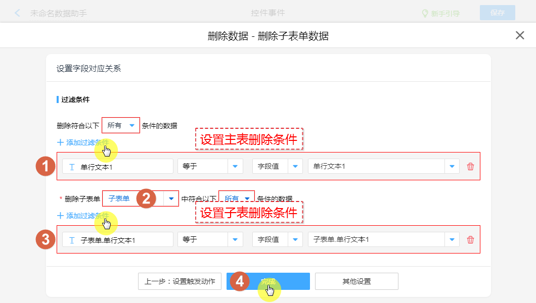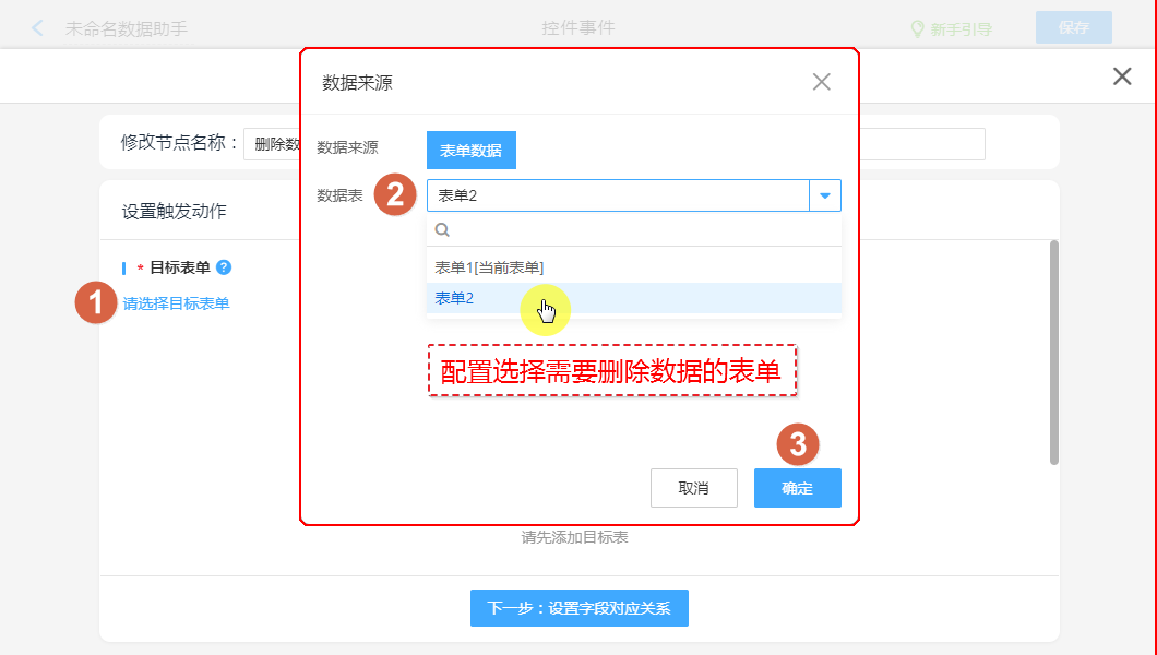 ②、设置要删除数据的子表单。