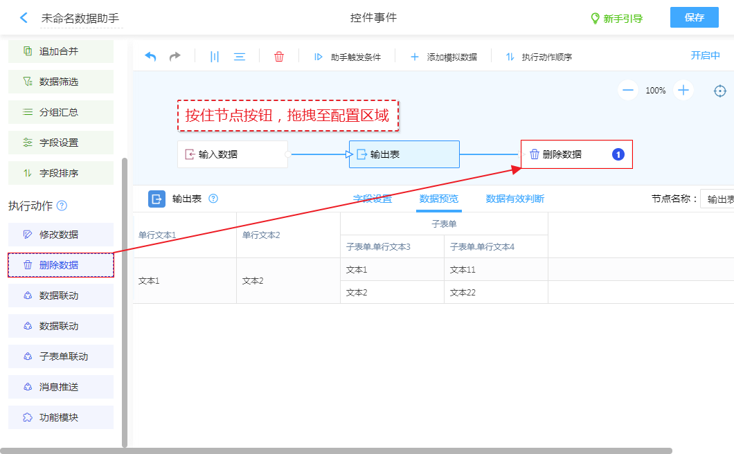 创建“删除数据”动作节点,将“输出表”的数据匹配其他表进行删除操作。